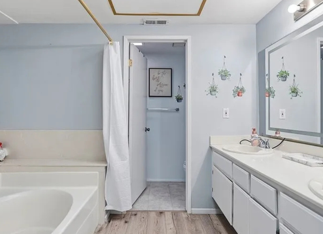Upstairs, the primary suite offers a private retreat. It includes a jacuzzi tub, a double sink vanity, and a separate shower. These features ensure both comfort and privacy. The private balcony adds another highlight. It offers beautiful mountain views and a calm setting.